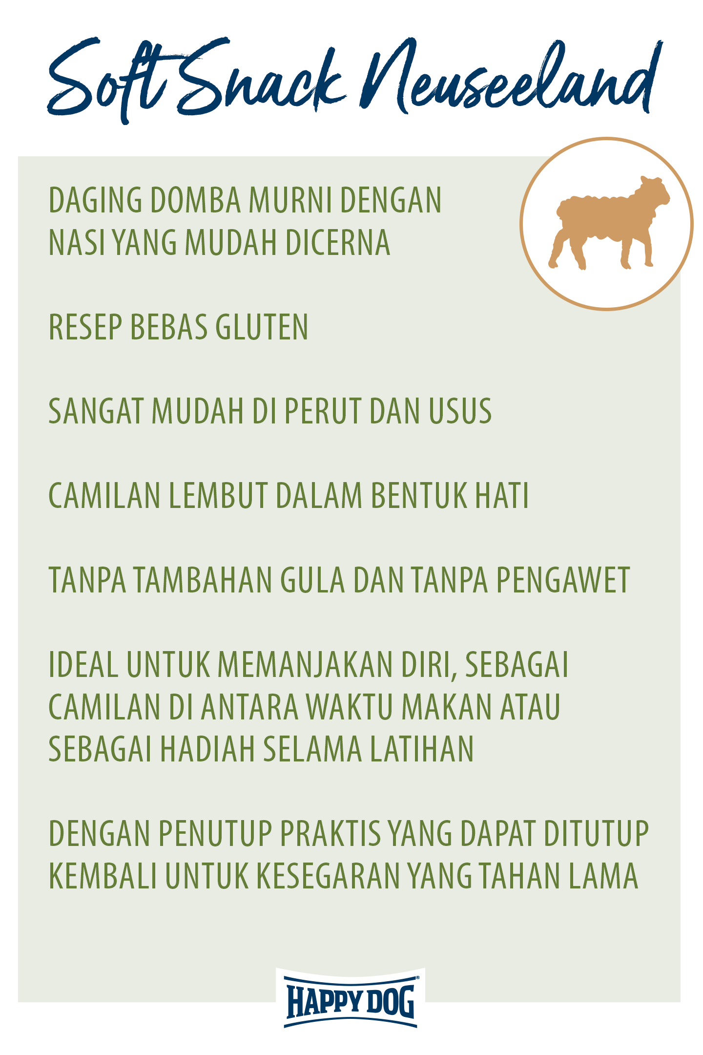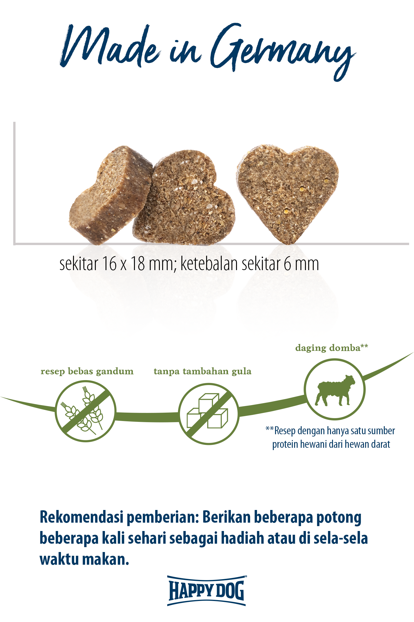 New Zealand Snack yang lembut dan berbentuk hati ini cocok untuk memanjakan teman berkaki empat Anda, atau sebagai camilan di sela makan. Daging domba terbaik dan beras ringan yang mudah dicerna dapat ditoleransi dengan sangat baik dan sangat lembut di perut dan usus. Resep bebas gluten dan ukuran kibble berbentuk hati sangat disesuaikan dengan kebutuhan anjing berukuran sedang dan besar yang sensitif atau sulit dipuaskan. Tentu saja penganan tersebut dibuat tanpa tambahan gula dan bahan pengawet. Bungkusnya memiliki penutup yang praktis untuk kesegaran yang tahan lama. Camilan enak untuk dinikmati anjing Anda!