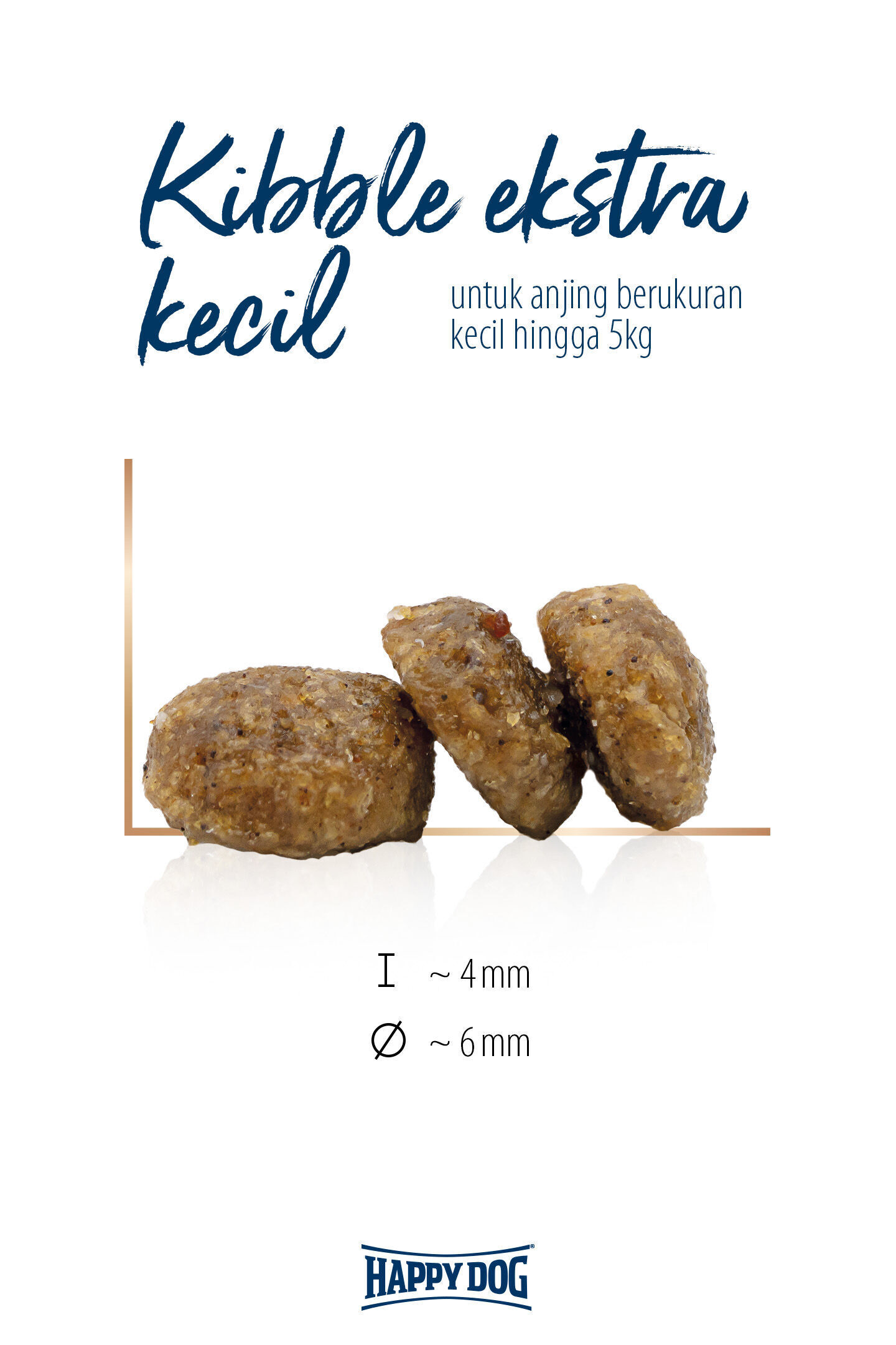 Kibble ekstra kecil ideal untuk anjing yang berukuran sangat kecil hingga yang memiliki berat 5 kg.